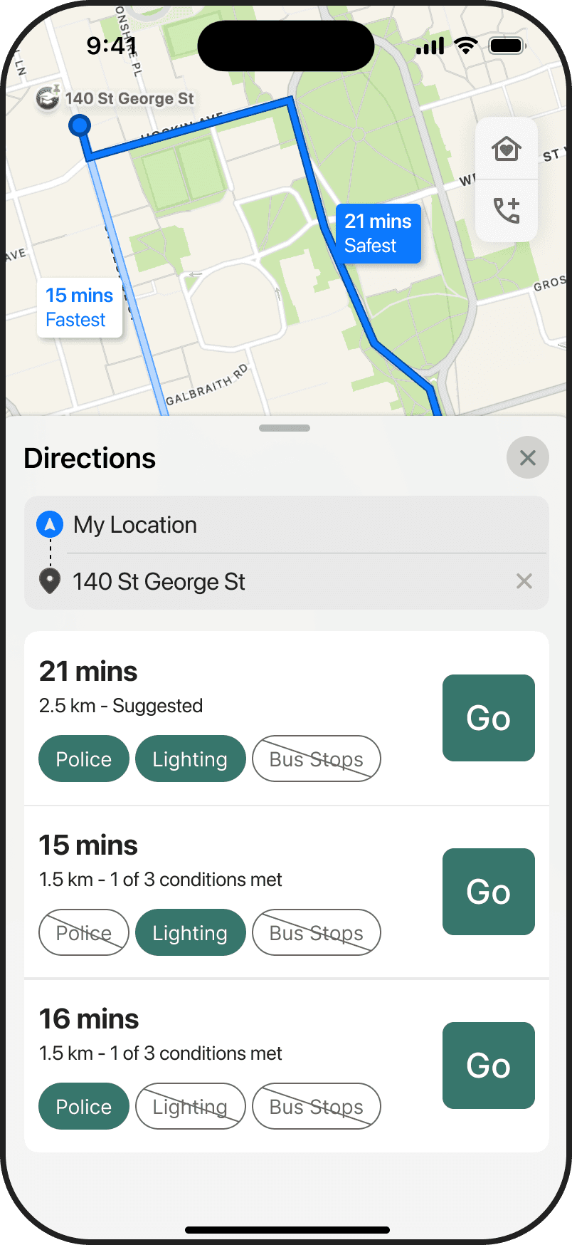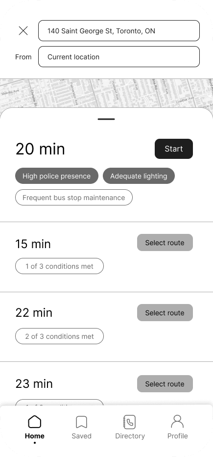 Navigation overview with each route displaying various safety features available on route.