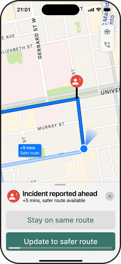 Annabella works for a growing tech startup in downtown Toronto. While she likes her job, the unpredictable hours often require her to commute at night, when she feels especially unsafe. She would love to go out more often without being concerned for her safety.